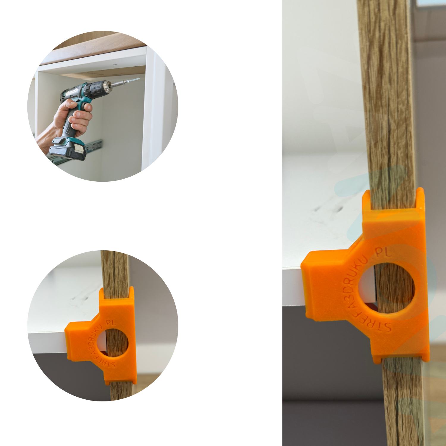 Uchwyty działają jak „trzecia ręka”, stabilnie przytrzymując elementy korpusów meblowych podczas wiercenia, klejenia i skręcania. Pomagają w utrzymaniu kąta prostego bez potrzeby angażowania drugiej osoby.